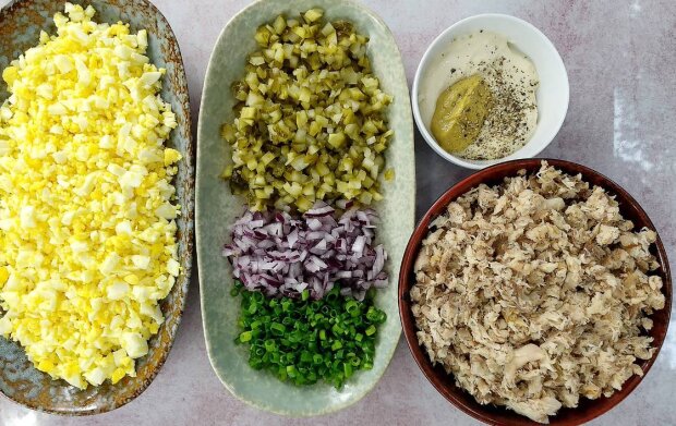 - Jajka ugotowane na twardo obierz i posiekaj w drobną kostkę.