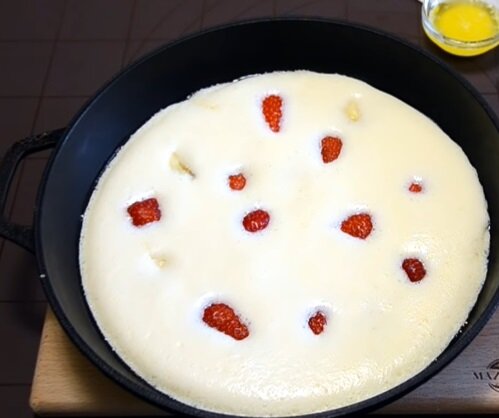 Wlać olej do gorącej patelni, a następnie ciasto. Rozłóż owoce i jagody na wierzchu. Piec w piekarniku przez 15-20 minut w temperaturze 220 ° C. W trakcie pieczenia naleśnik unosi się nierównomiernie - tak powinno być. Gdy skorupa jest smażona na wierzchu, holenderski naleśnik można wyciągnąć z piekarnika. Tradycyjnie polej gotowy placek roztopionym masłem, posyp sokiem z cytryny i posyp cukrem pudrem.