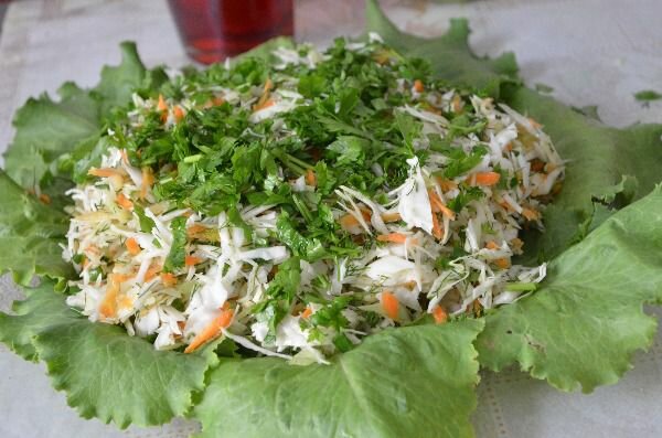 1. Posiekaj kapustę, drobno posiekaj sałatę i warzywa.