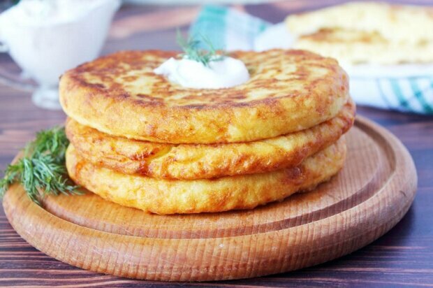 Z tej ilości ciasta wyjdzie 4 placka: obsmaż każdy z nich z obu stron na patelni z dodatkiem oleju.