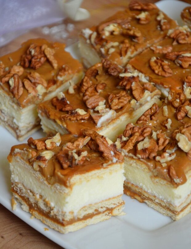 - Kolejno wyłożyć masę budyniową i przykryć ją kolejną warstwą herbatników. Na koniec wysmarować powierzchnię ciasta pozostałym kajmakiem i posypać orzechami włoskimi.
