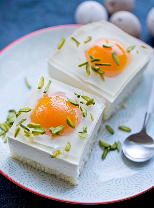 - 16 połówek moreli odłożyć na bok, najlepiej na ręcznik papierowy, aby jeszcze ociekły z soku. (Będą potrzebne na wierzch ciasta). Resztę moreli ułożyć na masie serowej wypukłą stroną do góry. Zalać resztą masy. Na wierzchu ułożyć w równych odstępach odłożone morele, również wypukłą stroną do góry.