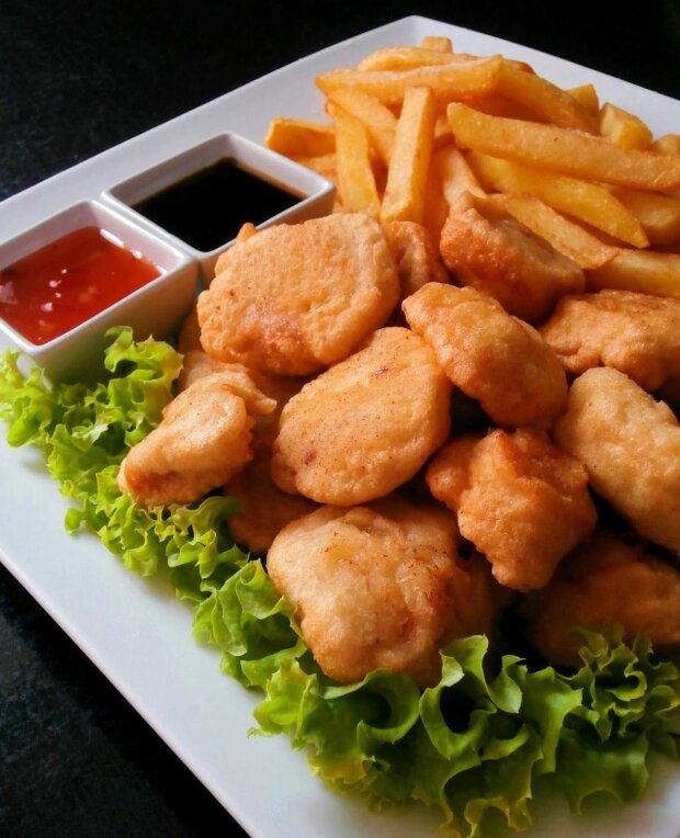 Gotowe kurczaczki podajemy np. z frytkami oraz dowolnymi sosami.