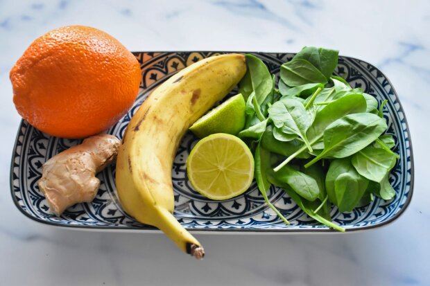 Banana, pomarańczę i imbir pokrój na mniejsze kawałki. Dodaj sok z limonki, szpinak i wodę. Dokładnie zblenduj.