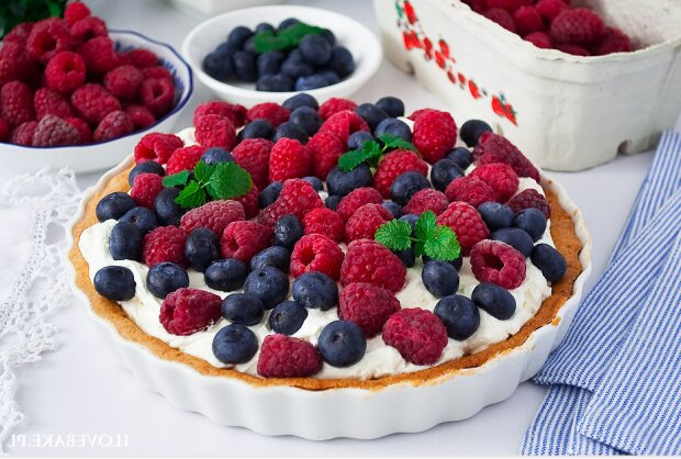 - Wykładamy na ciasto i dekorujemy świeżymi owocami.