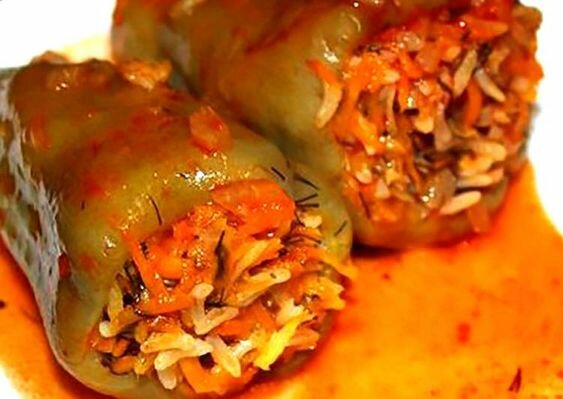 Napełnij każdą paprykę mielonym mięsem. W niewielkiej ilości oleju piecz paprykę ze wszystkich stron na złoty kolor. Ułóż smażoną paprykę w rondelku na wierzchu pieczeni. Zalej wodą, aby górna warstwa nie była całkowicie pokryta. Podpalić i doprowadzić do wrzenia. Dodaj posiekany czosnek, ziarna pieprzu i liść laurowy. Przykryj i gotuj na małym ogniu przez 40 minut. Wypełnij preparat.