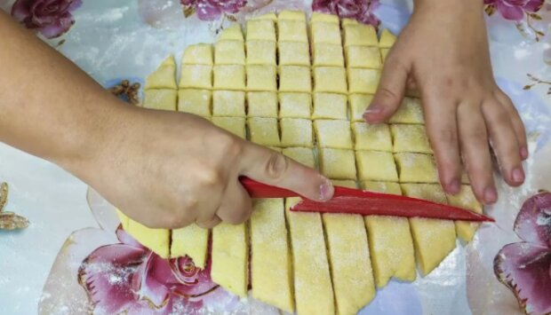 Odkurz powierzchnię roboczą mąką, wyłóż ciasto i zwiń w warstwę, której grubość wyniesie 5-10 mm. Warstwę posyp cukrem i pokrój w małe kwadraty. Przenieś wykroje na blachę do pieczenia, która zostanie wyłożona papierem do pieczenia. Przestrzegać odległości między obrabianymi przedmiotami. Rozgrzej piekarnik do 180 °. Umieść ciasteczka na 12-13 minut.