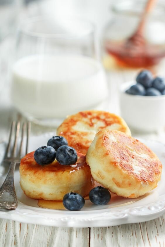 Twaróg jest zmieszany z jajkami i sody. Dalej mieszać. Płatki owsiane rozdrobnione w mikserze do mąki. Następnie połącz płatki owsiane, cukier i sól z masą twarogową. Dokładnie wymieszać. Robić ciasta serowe, smażyć na patelni z olejem roślinnym. Podawać z jagodami, śmietaną i miodem.