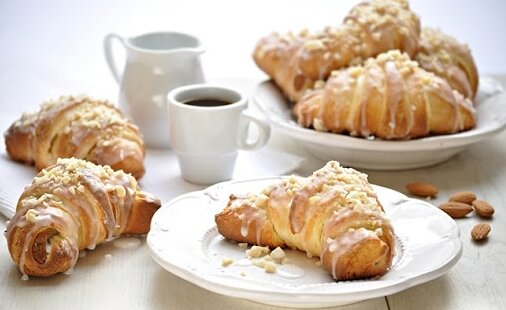 5. Dekoracja. Gotowe rogale świętomarcińskie posmaruj lukrem i posyp posiekanymi migdałami i pomarańczową skórką. Smacznego!