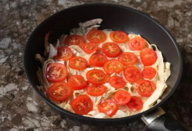 Wlej mieszaninę na patelnię. Powinien całkowicie przykryć chleb pita. Pokrój pomidory w cienkie kółka lub plasterki i ułóż na wierzchu pita. Ser zetrzeć na grubej tarce. Można to zrobić bezpośrednio nad patelnią, aby uniknąć poplamienia naczyń. Zamknij pokrywkę i gotuj przez 7-8 minut, aż ser się rozpuści.