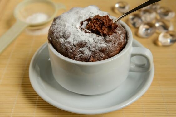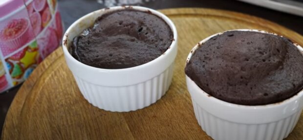 Wymieszaj wszystkie składniki w misce, aż będą gładkie. Jeśli robisz jedną dużą porcję, ugniatanie można zrobić bezpośrednio w kubku. Ciasto podzielić na 2 filiżanki po 150 ml. Na jedną dużą porcję odpowiedni jest kubek 250-300 ml. Gotuj w kuchence mikrofalowej z maksymalną mocą przez około 2 minuty. Wszystkie kuchenki mikrofalowe są różne, a czas gotowania może się różnić.