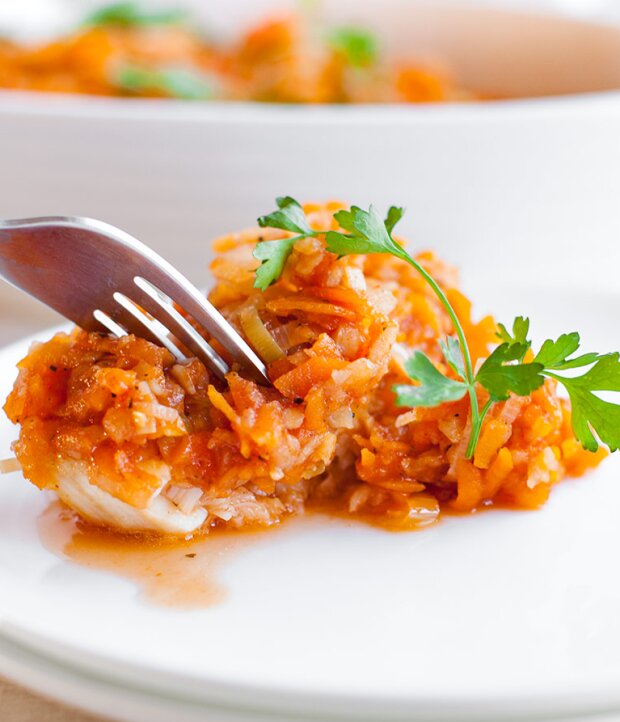 - Umyj marchewki, seler i pietruszkę. Obierz je i zetrzyj na tarce o grubych oczkach. Na patelni rozgrzej 4 łyżki oleju z pestek winogron i wrzuć starte warzywa. Podsmaż je, a następnie dodaj szczyptę soli i trochę wody. Duś pod przykryciem.