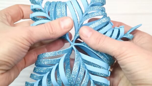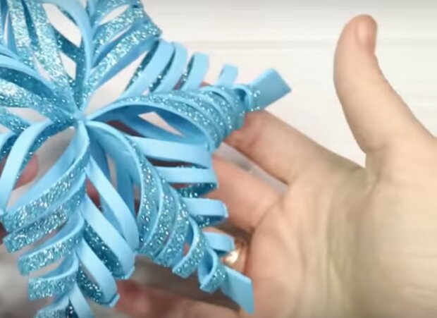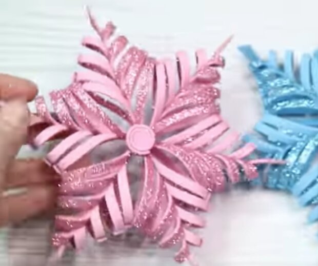 Na koniec wytnijcie z pianki brokatowej koło i umieśćcie go na środku śnieżynki – tam, gdzie łączą się wszystkie elementy.