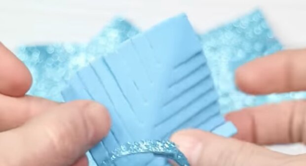 Dziś chcemy opowiedzieć wam, jak można samemu zrobić brokatową śnieżynkę na choinkę. W tym celu nam będzie potrzebna arkusze pianki brokatowej o grubości 2 milimetrów: najpierw należy wyciąć z nich kilka kwadratów o wymiarach 6*6 centymetrów.