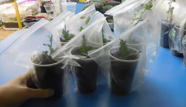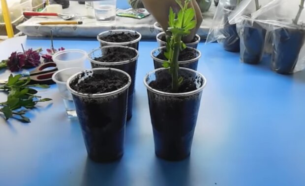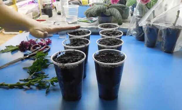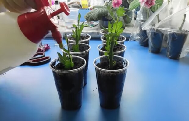 Przed ukorzenieniem każdą łodygę należy zwilżyć czystą wodą i specjalnym roztworem. Następnie sadzimy je na głębokość jednego centymetra i podlewamy wodą.