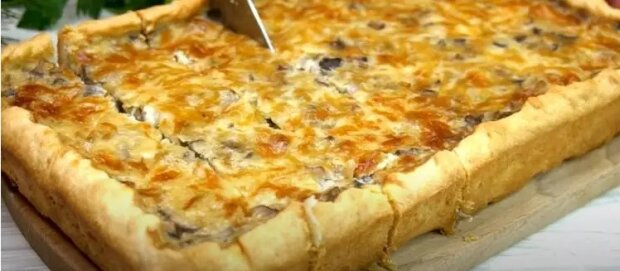 Ser zetrzeć grubą tarką i wymieszać z nadzieniem grzybowym. Ser można pobrać z mozzarelli lub innych twardych odmian. Na wierzchu zostaw trochę sera do posypania. Wyjmij ciasto z lodówki i rozwałkuj je wałkiem do ciasta. Przyjmij kształt, który pasuje. Możesz wziąć formę o wymiarach 31 × 23 cm, a boki w wysokości 4,5 cm. Ciasto wyłożyć do foremki i rozprowadzić rękami, uformować boki i zrobić brzegi. Teraz przełożyć nadzienie na ciasto, spłaszczyć i posypać pozostałym serem. Wciśnij ser do nadzienia, aby nie zestalił się zbyt szybko.