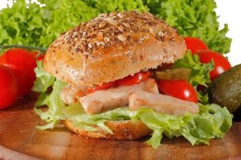 - Na gotową bułkę układamy mix sałat, pokrojonego w plasterki kurczaka i pomidora.