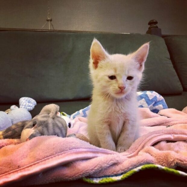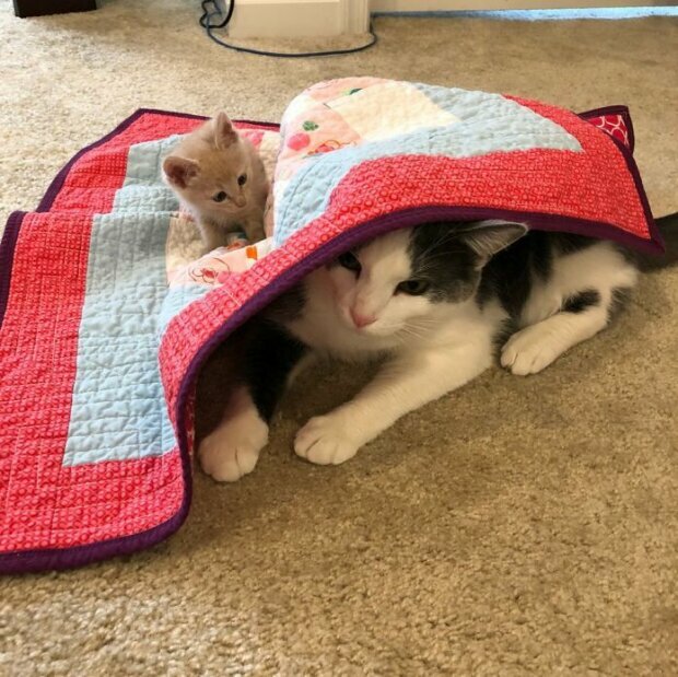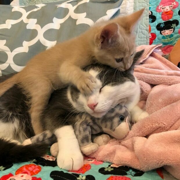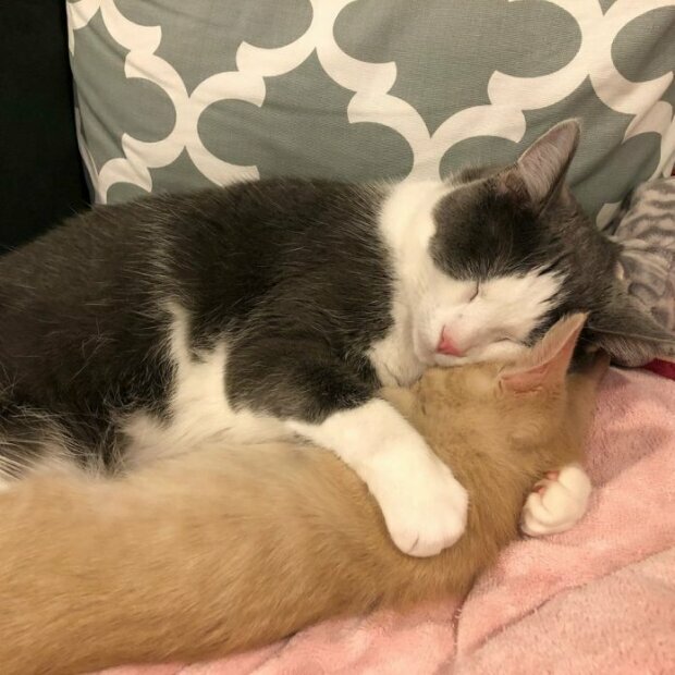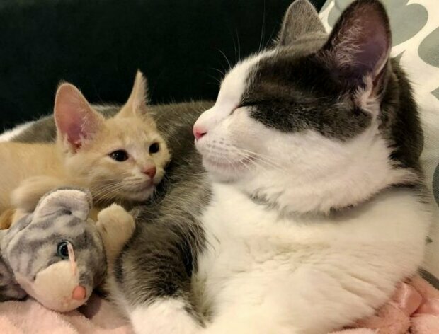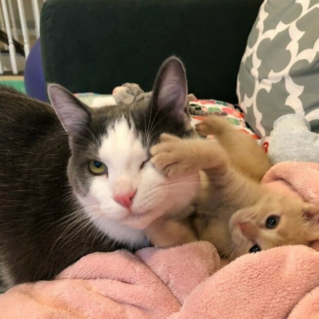 Dwa koty Anne, a mianowicie Cookie i Stinky, wcale nie chciały bawić się z maluchem. Jednak kociak postanowił za wszelką cenę pozyskać przychylność Cookie.
