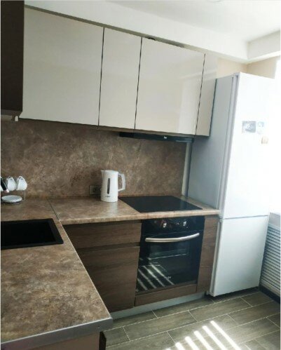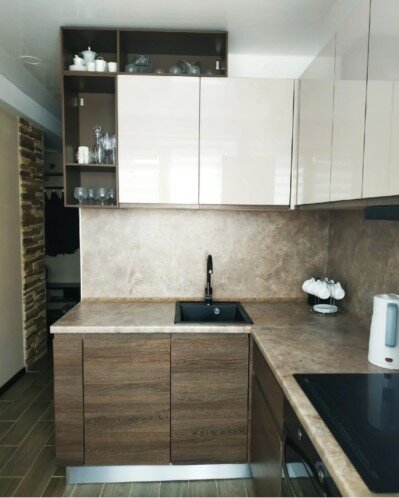 Zestaw mebli kuchennych zamówiłem w dwóch kolorach, dolne szafki są brązowe w kolorze fliz, a górne w kolorze beżowym. Wybrałem narożny zestaw kuchenny, aby było więcej miejsca na powierzchnię roboczą.