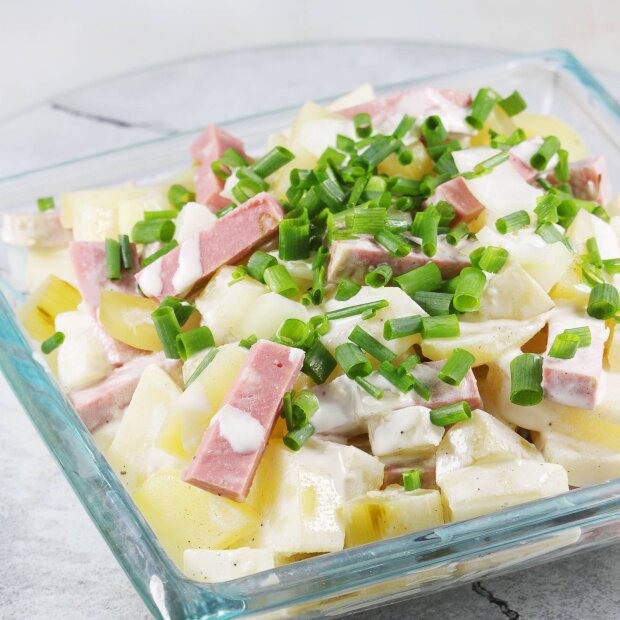 - Sałatkę polej białym sosem a na koniec przykryj całość posiekanym szczypiorkiem. Sałatka szwabska najlepiej smakuje podana na zimno, prosto z lodówki.
