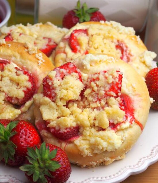 - W każdej bułce, dnem szklanki robimy wgłębienie. Do każdego wgłębienia wkładamy łyżkę twarogu, pokrojone truskawki. Posypujemy kruszonką.
