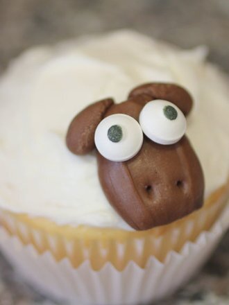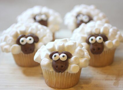 - Kiedy babeczki już całkowicie wystygną udekoruj je białym kremem. Ten także możesz przygotować z jednej z gotowych receptur, którą dostaniesz w sklepie. W pobliżu krawędzi każdej babeczki zamocuj głowę baranka.