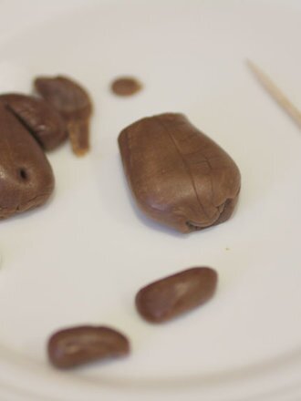 - W czasie kiedy będa w piekarniku zajmij się główkami baranka. Zrobimy je z cukierków toffi. Włóż cukierki na 15 sekund do mikrofalówki, żeby nieco zmiękły. Jednego cukierka spłaszcz od spodu i ściśnij w pobliżu jednego z końców. Odetnij dwa kawałki drugiego cukierka i uformuj z nich uszy baranka. Przyklej je po bokach głowy. Za pomocą lukru przymocuj do głowy baranka cukierkowe oczy, wykałaczkami zrób nozdrza.