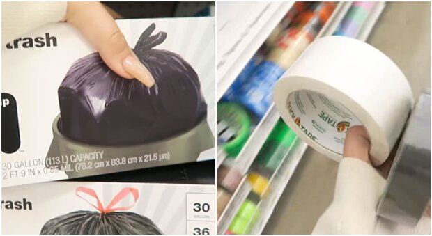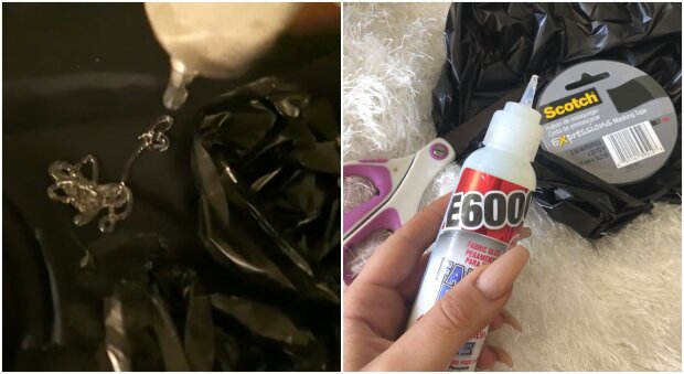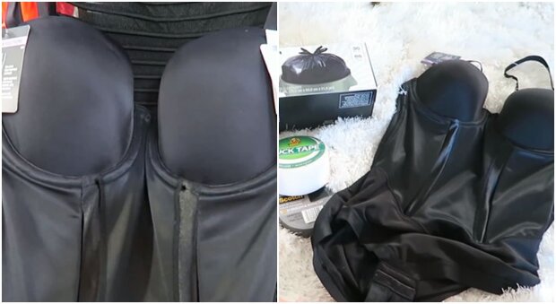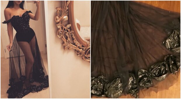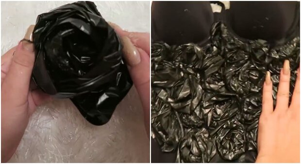 Zgniecione worki na śmieci są przyklejone do podstawy sukienki, która będzie gorsetem.