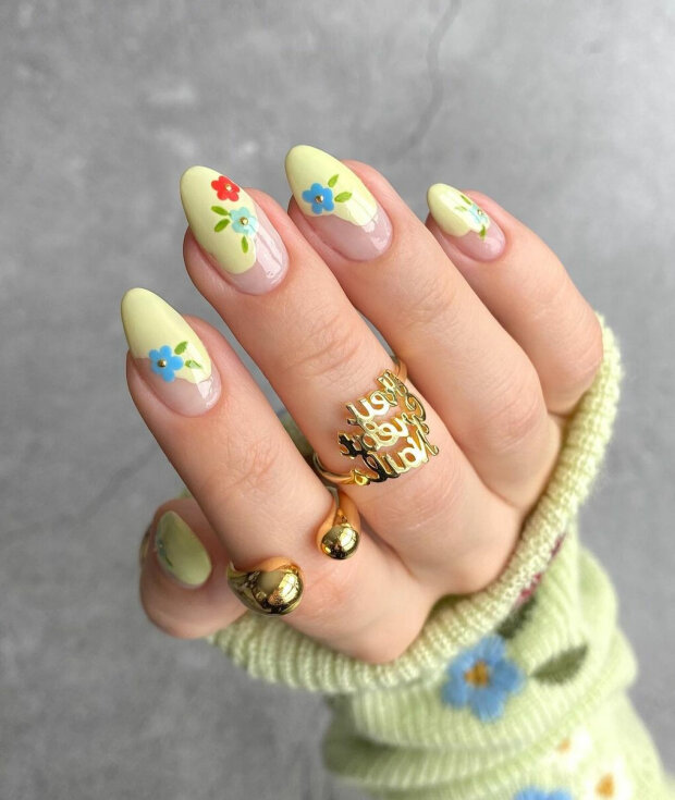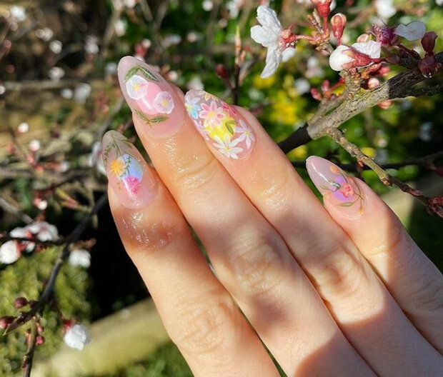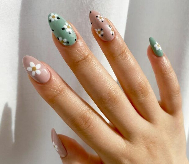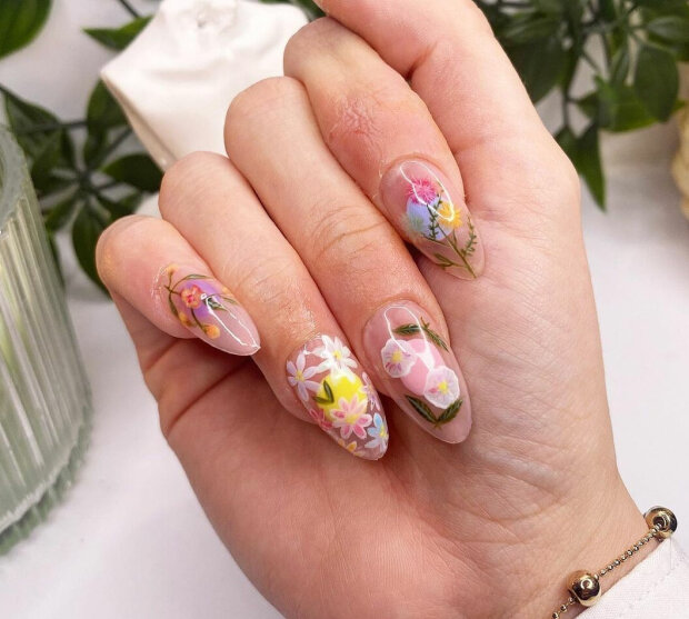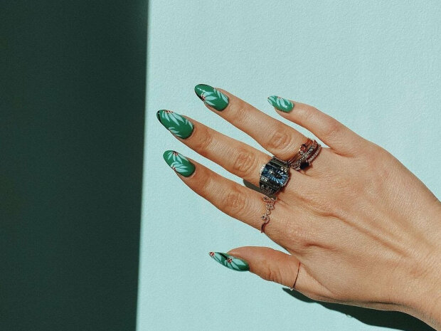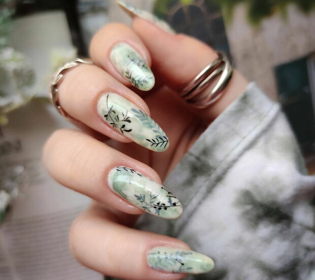 Możesz pomalować wszystkie paznokcie zielonymi wzorami lub nałożyć kwiaty we wszystkich możliwych odcieniach na przezroczystą bazę.
