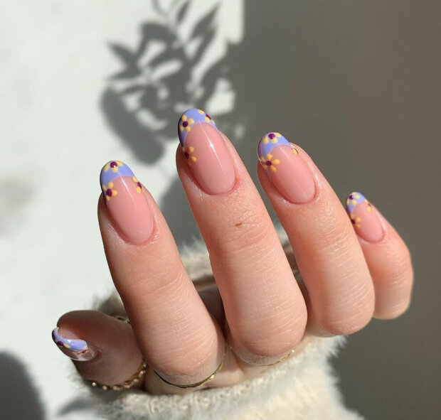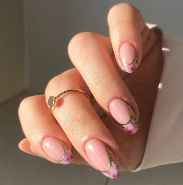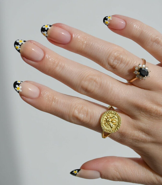 Miłośniczkom francuskiego manicure na pewno spodoba się nieco zmodyfikowana wersja tej stylizacji – zamiast zwykłej bieli na czubku paznokcia można narysować kwiatowy wzór.