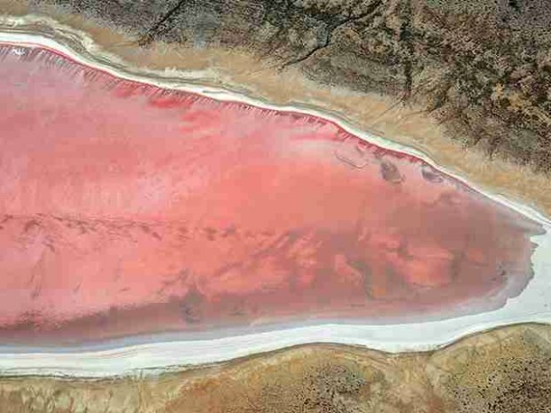 Jezioro Eyre jest położone na odległości 700 kilometrów od Adelajdy i nosi honorowy tytuł największego słonego jeziora w Australii. To jezioro dość rzadko zostaje wypełnione wodą – w ciągu ostatnich 160 lat to wydarzyło się tylko trzy razy. Ogólnie powierzchnia wody w jeziorze Eyre ma brązowy kolor i tylko w kilku miejscach można zobaczyć różowe plamy. To zjawisko można wytłumaczyć tym, że kiedy jezioro zaczyna wysychać, w nim zaczynają rozmnażać się halofity (rośliny odporne na zasolenie podłoża), które nadają wodzie odcienie różu.