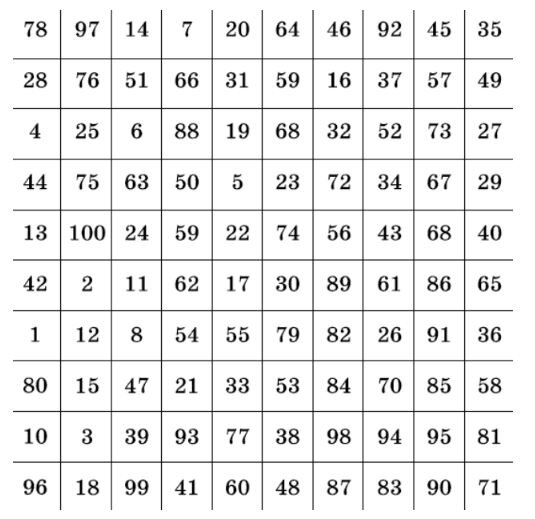 1, 11, 21, 31, 41, 51, 61, 71, 81, 91, 100