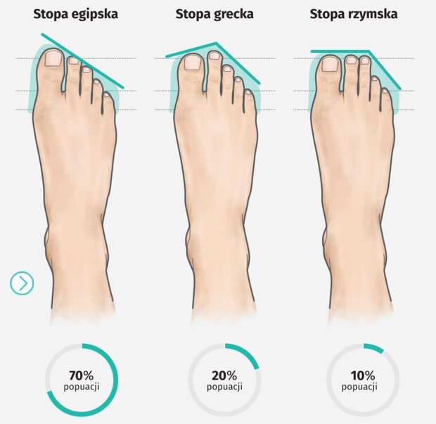 Taka stopa cechuje się tym, że każdy następny palec jest mniejszy od poprzedniego i jak widać, większość ludzi na świecie wywodzi się właśnie od Egipcjan. Tacy ludzie nazywani są marzycielami, którzy wciąż tylko snują plany na przyszłość. Do tej grupy zaliczamy ludzi bardzo ambitnych, którzy kochają uczyć się nowych rzeczy.