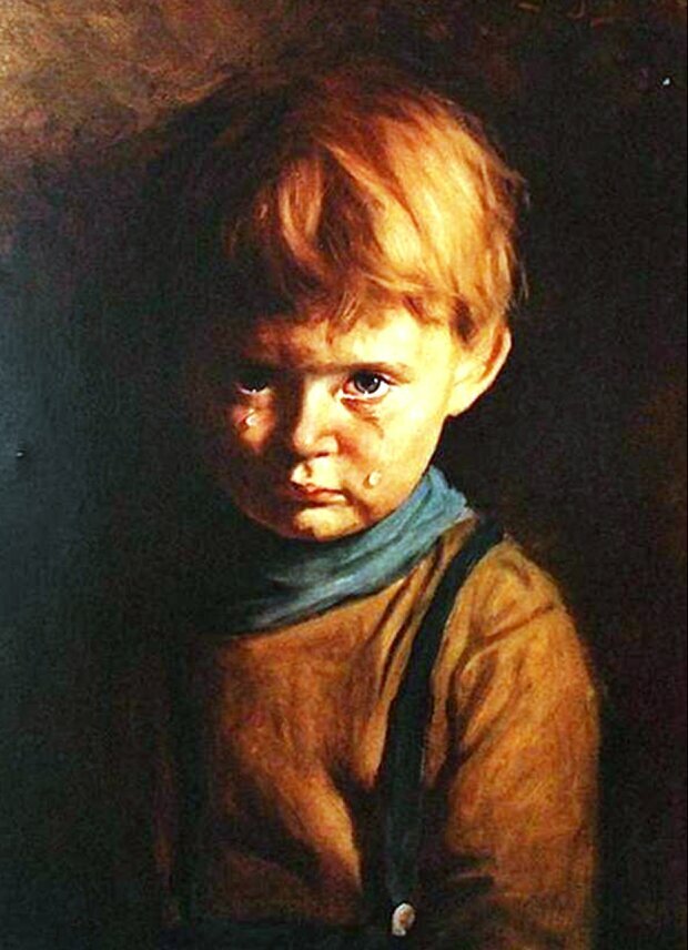 Mówią, że chłopiec na zdjęciu wygląda tak realistycznie dzięki temu, że chłopczyk, który pozował artyście, naprawdę płakał. On patrzy złowrogo, a po policzkach spływają mu łzy.
