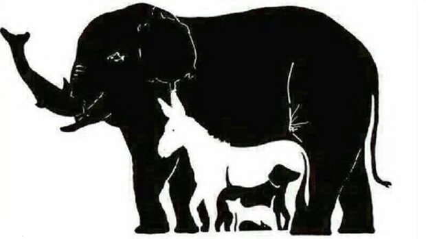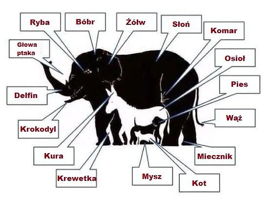 Może się to wydawać nieprawdopodobne, ale na tym obrazku można wyszukać aż 16 różnych zwierząt. Słonia, osła, psa, kota i mysz na pewno każdy znajdzie bez problemu. Schody zaczynają się jednak, gdy mamy wyodrębnić kolejne zwierzęta. Na obrazku znajdują się jeszcze: ryba, bóbr, żółw, komar, wąż, miecznik (gatunek ryby), krewetka, kura, krokodyl, delfin i głowa ptaka.