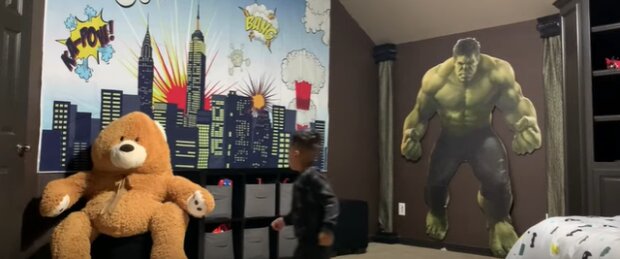 Dziecko wbiegło po schodach i krzyczało, że miś się poruszył! Mama Aarona zawsze była bardzo pomysłowa, ponieważ sama zaprojektowała projekt jego pokoju. Na jednej ze ścian pokoju przerażająca postać Hulka, która z łatwością może przestraszyć każdego.