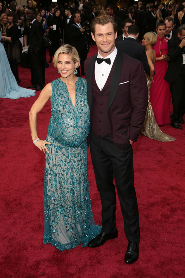 Która czekała na bliźniaków, pojawiła się na czerwonym dywanie z mężem Chrisem Hemsworth w 8 miesiącu ciąży. Miała na sobie strój w kolorze fali morskiej z Elie Saab, wypełniony olśniewającą biżuterią.
