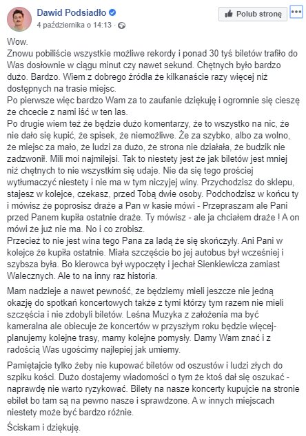 Artysta, tuż po zakończeniu sprzedaży biletów opublikował długą wiadomość dla swoich wiernych fanów. Napisał w niej, że strasznie dziękuje za zaufanie wobec jego muzyki. Zapowiedział także, że w przyszłym roku również odbędą się koncerty z serii Leśnej Muzyki i może wtedy, teraźniejsi nieszczęśliwi, którzy nie zdążyli zakupić biletów – będą mieli okazję spotkać się z nim na koncercie. Trzymamy za słowo !
