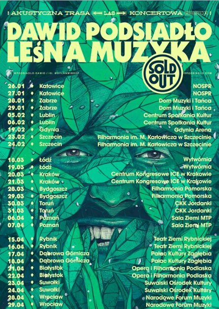 Dawid Podsiadło razem z Taco Hemingwayem zagrali na PGE Narodowym największy koncert w historii polskiej branży muzycznej. Podsiadło po zachwycającym koncercie zapowiedział kolejną trasę koncertową, która rozpocznie się w już w styczniu 2020 roku. Koncerty odbędą się w 14 miastach. Leśna muzyka będzie pierwszą akustyczną trasą w karierze Dawida. Artysta mówił o poszerzonym składzie zespołu, nowych instrumentach i zapowiedział, że będzie to zupełnie nowa odsłona – „Na pewno będziemy się bawić formą i eksperymentować. Będzie fajnie, obiecuję" – dodaje. Podczas występów muzyk będzie mówił także o działaniach mających na celu szerzenie świadomości ekologicznej, co jest dla niego szczególnie ważnym tematem.