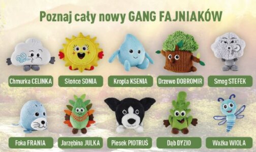Nowe maskotki przedstawiają drzewa, słońce, zwierzęta, a w kolekcji znalazł się nawet pluszak przedstawiający smog. Nazwy pluszaków to: Chmurka Celinka, Dąb Dyzio, Drzewo Dobromir, Foka Frania, Jarzębina Julka, Kropla Ksenia, Piesek Piotruś, Słońce Sonia, Smog Stefek oraz Ważka Wiola.