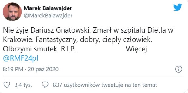 W rozmowie z TVN24 powiedział tak samo o tym, że "Gnatowski miał objawy zakażenia koronawirusem, jednak nie zdążono wykonać mu testu ze względu na jego stan". Według źródeł RMF24 aktor "miał zapalenie płuc i ciężką niewydolność oddechową".