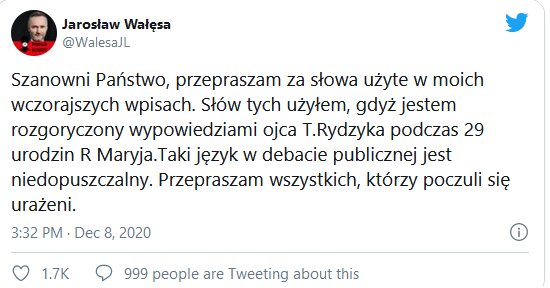 Szanowni Państwo, przepraszam za słowa użyte w moich wczorajszych wpisach. Słów tych użyłem, gdyż jestem rozgoryczony wypowiedziami ojca T.Rydzyka podczas 29 urodzin R Maryja.Taki język w debacie publicznej jest niedopuszczalny. Przepraszam wszystkich, którzy poczuli się urażeni.