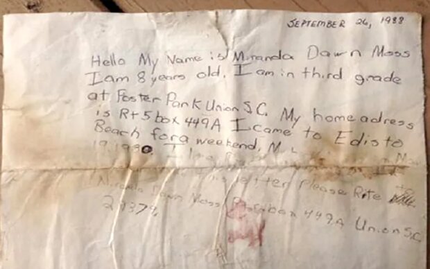W butelce znajdowała się wiadomośc z roku 1988. 8 letnia wówczas Miranda napisała krótką wiadomość. Podała także swoje dane dla kogoś, kto kiedyś odnajdzie ten list.