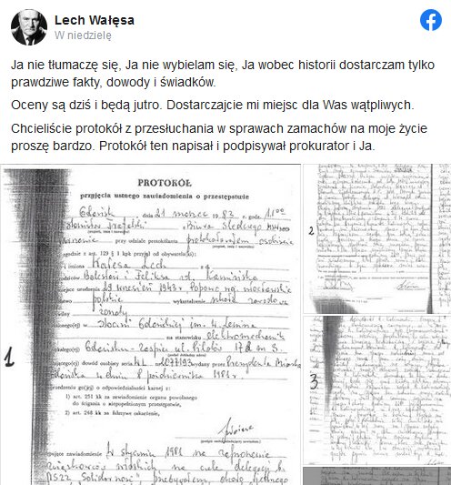 Tym razem Lech Wałęsa pokazał właśnie protokoły z przesłuchania dotyczącego, jak sam określił: zamachów na jego życie! Ujawnił przerażające fakty ze swego życia. Napisał w internecie ,że nie zamierza w żaden sposób się tłumaczyć czy wybielać.Ujawnił protokoły w pewnego przesłuchania: