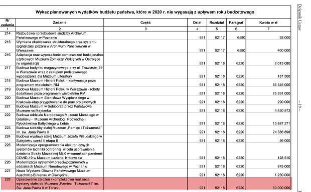 W rozporządzeniu widnieje propozycja wsparci dla instytucji powiązanej z o. Rydzykiem. Chodzi o Muzeum "Pamięć i Tożsamość" im. św. Jana Pawła II w Toruniu. . Kwota 60 mln zł przeznaczona jest, wedle opublikowanego dokumentu, na "opracowanie założeń i kompleksowa realizacja wystawy stałej do Muzeum".