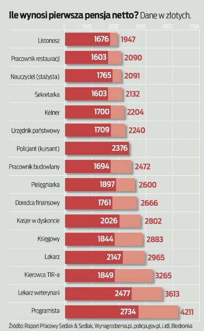 Największym zaskoczeniem jest wysoka pozycja kasjerów w dyskontach. Ich pensje mogą być nawet o 700 złotych wyższe od pensji nauczycieli czy o 200 złotych wyższe od pensji pielęgniarek.