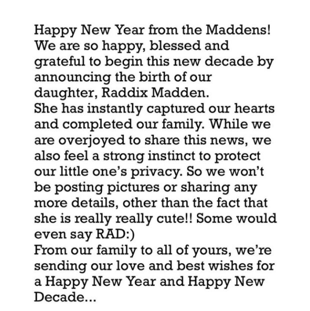 "Szczęśliwego roku od Maddenów! Z radością, błogosławieństwem i wdzięcznością chcielibyśmy rozpocząć nową dekadę ogłoszeniem o narodzinach naszej córki Raddix Madden. Od razu zdobyła nasze serca i dopełniła rodzinę"
