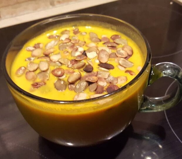 ,,Krem z dyni - light jesienna. Świeżą dynię lekko wstępnie podsmażamy BEZ TŁUSZCZU na patelni lub w WOKu z dodatkiem świeżego lub sproszkowanego czosnku, curry, soli i pieprzu. W malakserze miksujemy dynię z bulionem warzywnym (wywar świeżej włoszczyzny) , mlekiem kokosowym LIGHT, można też dolać dodatkowo mleko bez laktozy. Bulion i mleko w takiej proporcji, by zupa nie wyszła zbyt rzadka. Gotujemy 15 minut i podajemy z dodatkiem prażonych pestek dyni. Można dla aromatu i dekoracji dodać na wierzch kilka kropel oleju z pestek dyni. Jeśli lubicie wersję orientalną na ostro - z umiarem dodajemy CHILLI" – napisała Kasia w swoim Instagram.